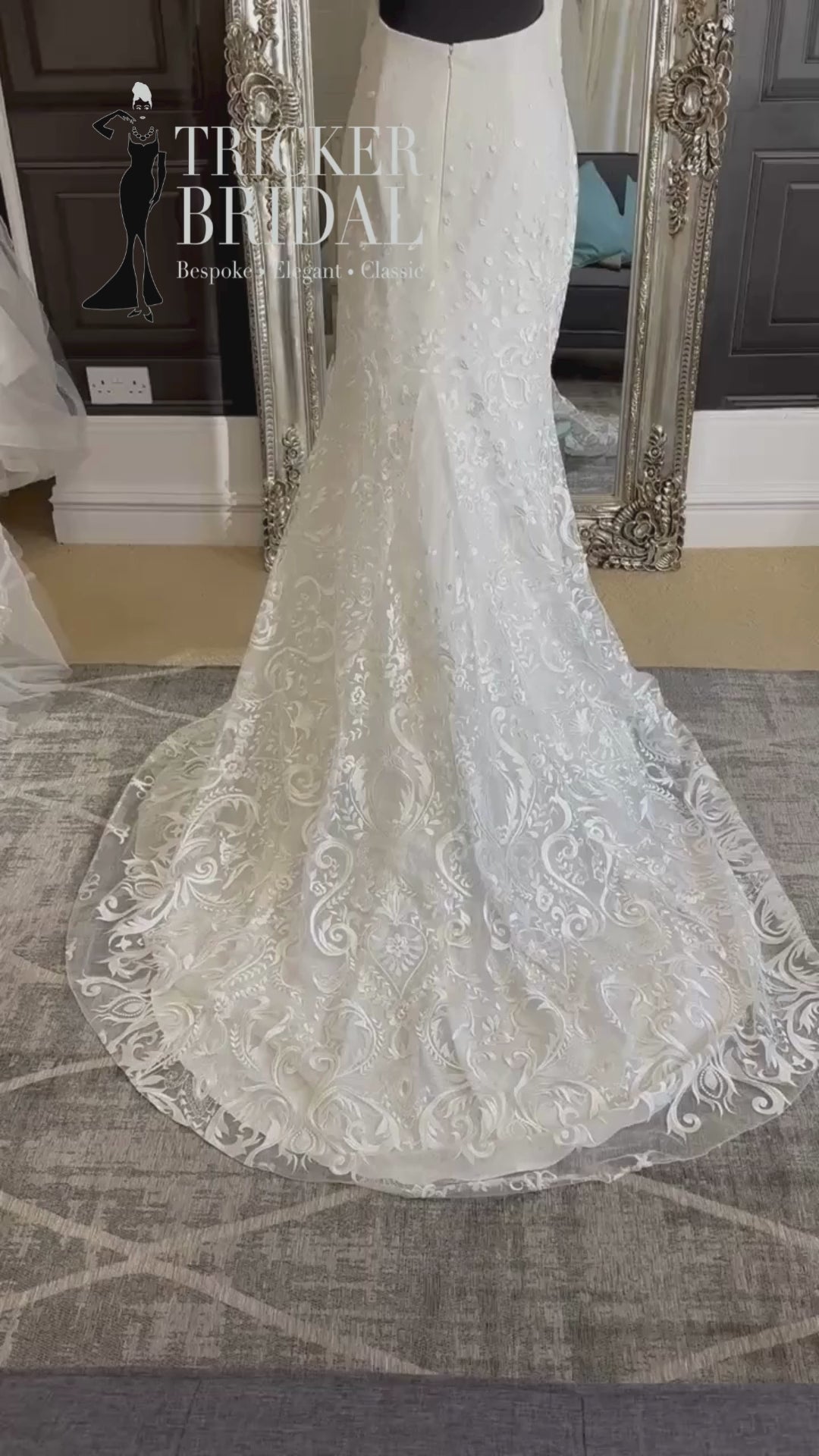 At the back, things turn daring: a dramatic keyhole cut-out and sweeping train guarantee a head-turning exit. With her fit-and-flare shape hugging in all the right places, she’s equally at home on a sun-drenched Amalfi terrace or in a candlelit cathedral aisle.