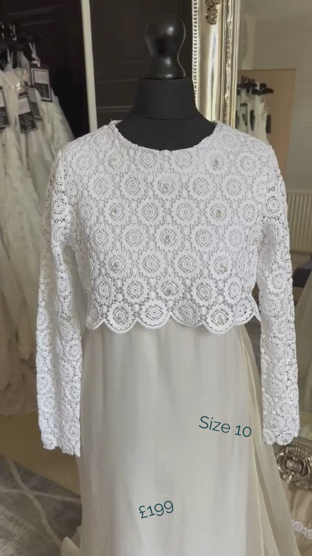 Empire line with slim column skirt and shaped train edged in daisy guipure lace. Long‑sleeved cropped jacket fastens with hooks and eyes; teardrop crystals scatter the bodice and sleeves. Tiny 3mm hole noted in train; otherwise immaculate. Try on in Aberdeen or buy now — worldwide shipping available.