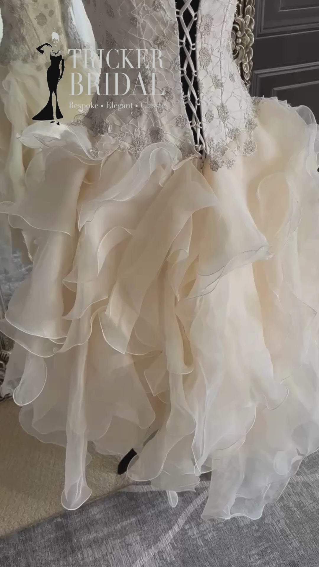 And then comes the skirt: a pale creamy apricot storm of asymmetrical organza ruffles, short at the front to show off your shoes, with a longer swoosh at the back for a cheeky bit of drama. It’s flirty, fun, and impossible to ignore.