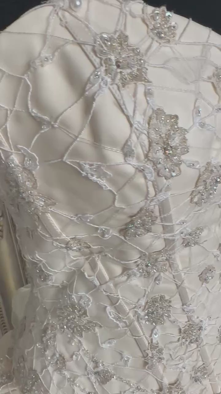 The heavily embellished bodice is a sparkling work of art, with cobweb lace peeking through a riot of sequins and rhinestones, all laced up at the back for that perfect corset fit. Then there’s the skirt — a soft pale creamy apricot whirlwind of asymmetrical organza ruffles, tea-length at the front for maximum shoe exposure, with a swoosh of extra length at the back for a hint of drama.