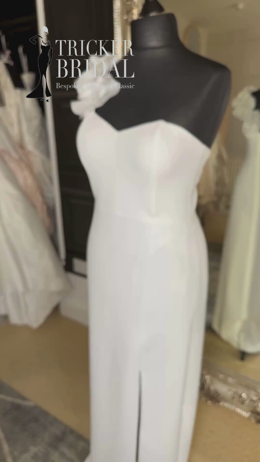 Bloom Boom is a one-shouldered dreamboat, with ivory flowers cascading dramatically across the shoulder. Soft, sculptural and ever so slightly surreal, it’s like stepping into a couture garden party. The sweetheart neckline keeps things romantic, while the straight silhouette brings sleek polish. A subtle side slit adds just enough sass – perfect for showing off a flash of leg or a killer shoe.