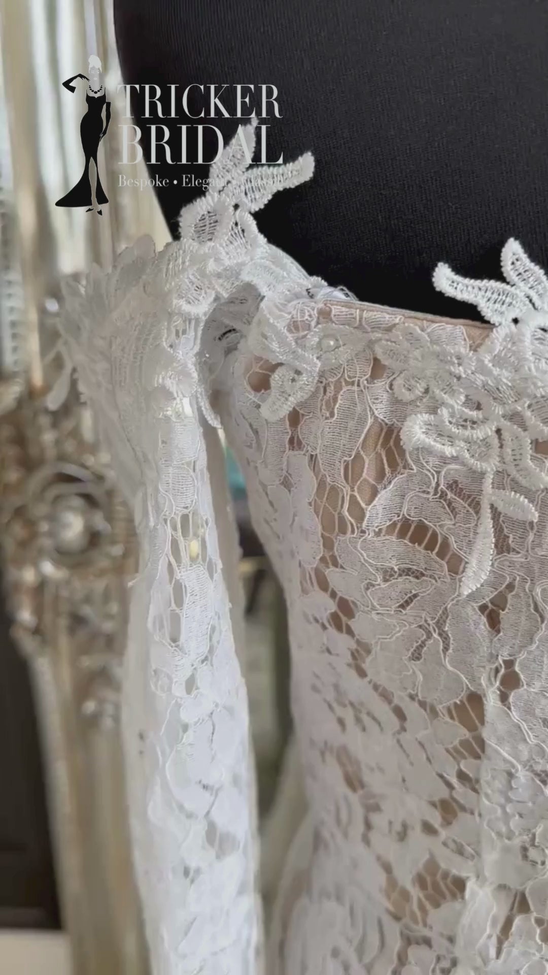 The strapless bodice is softened with scalloped lace appliqué across the neckline, giving her a romantic edge without tipping into frill. And then comes her party trick – detachable long lace sleeves that fasten to the bodice. Shoulders get their moment, arms get their cover, and you get two looks in one.