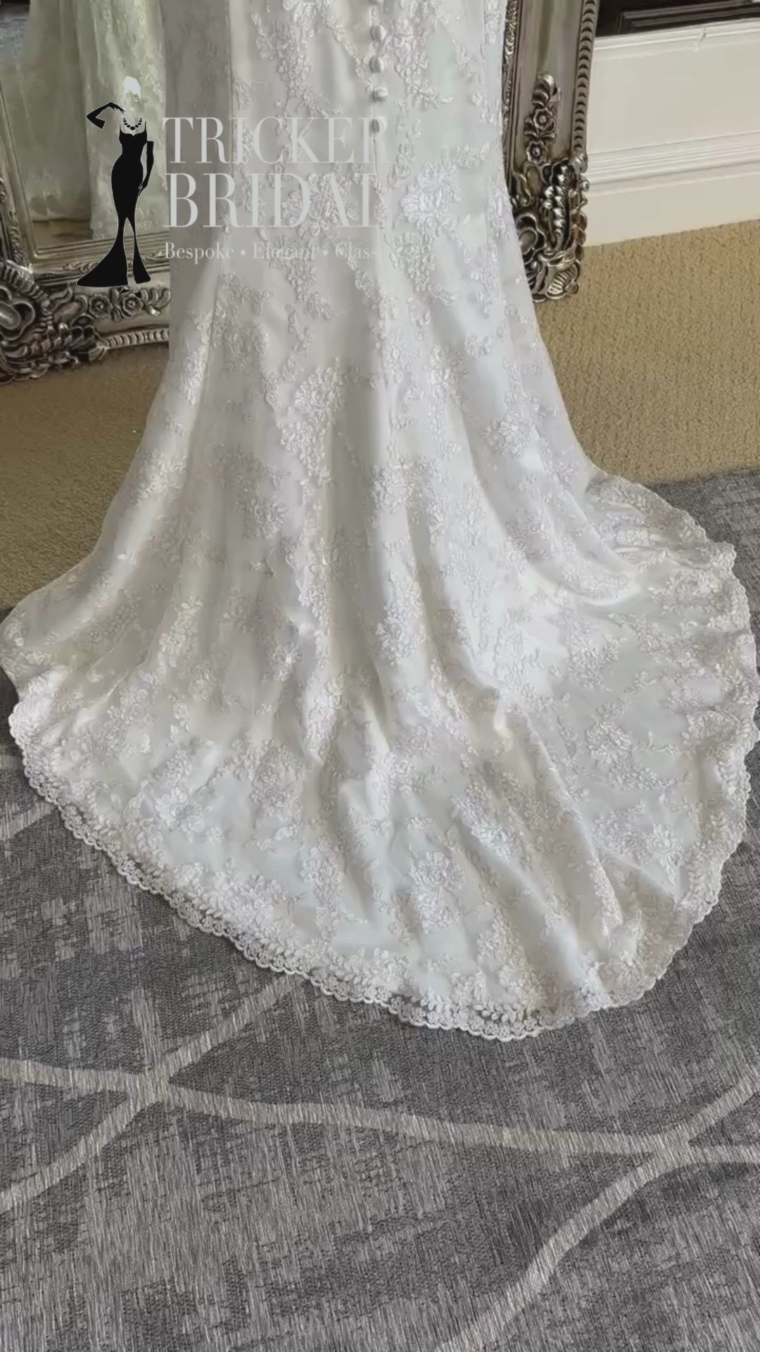 Figure-hugging in all the right places, she’s crafted in the softest ivory satin overlaid with the palest blush-pink lace. The strapless sweetheart neckline brings romance, while a row of covered buttons down the back (no zips here – just proper craftsmanship) add timeless bridal elegance. The train sweeps softly behind, edged in scalloped lace that’s delicate and refined without ever feeling fussy.