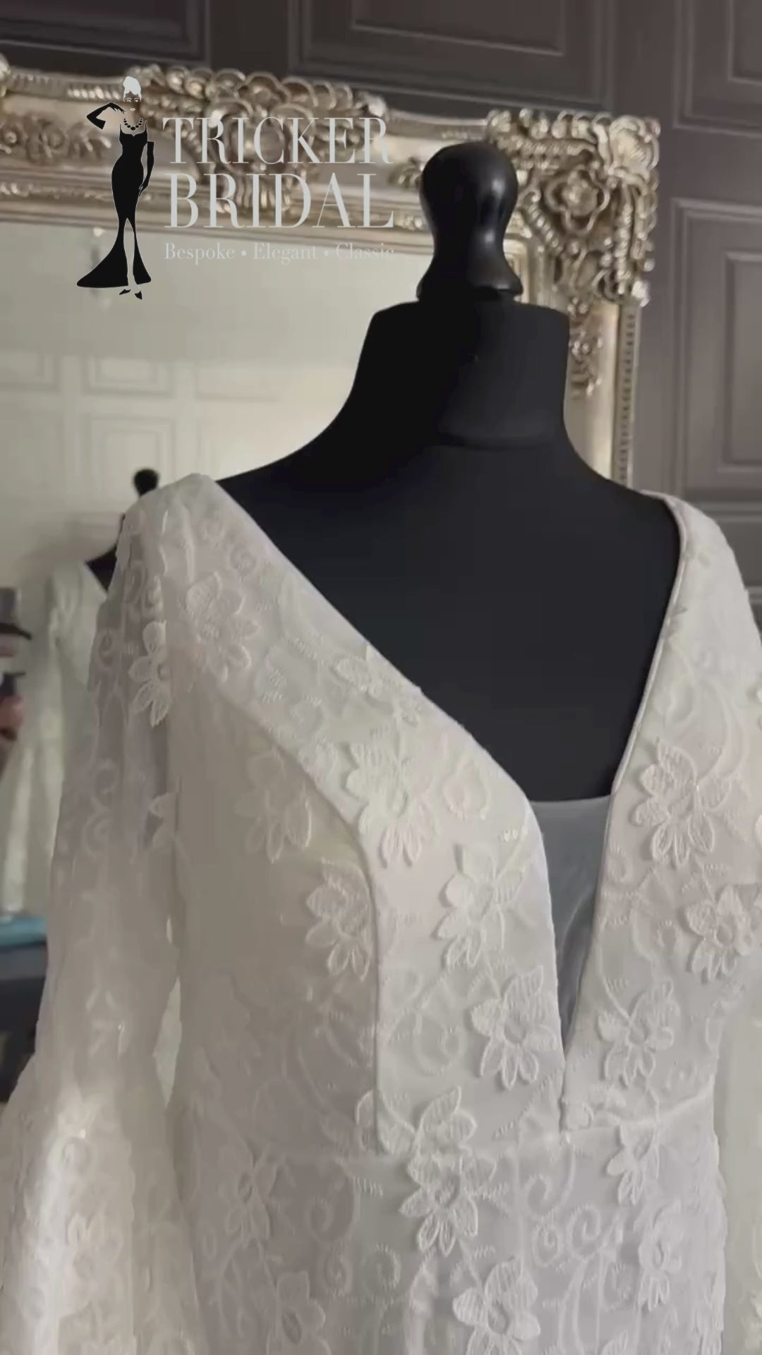 The skirt is a clean, straight silhouette in all-over lace, giving her that lovely contrast of modern line + romantic texture. The V back keeps things airy and elegant, and the slightly longer skirt length makes her a dream for taller brides or anyone who loves the idea of custom shortening for the perfect hem.