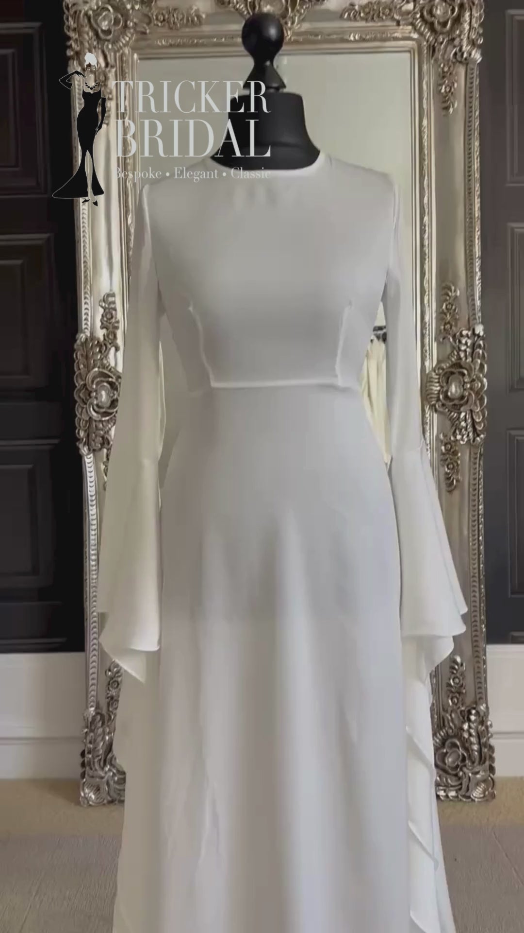 Beverley says, “She’s the kind of dress that makes you want to light candles, hum a bit of Enya and glide down an aisle strewn with wildflowers. Understated until she isn’t — those sleeves deserve their own fan club.”