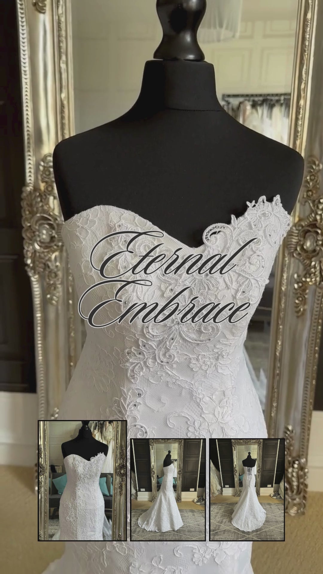 Head-to-toe lace brings timeless romance, while delicate appliqués frame the neckline and trail down the bodice. Subtle diamantés are scattered throughout, catching the light just enough to add a touch of sparkle as you move.