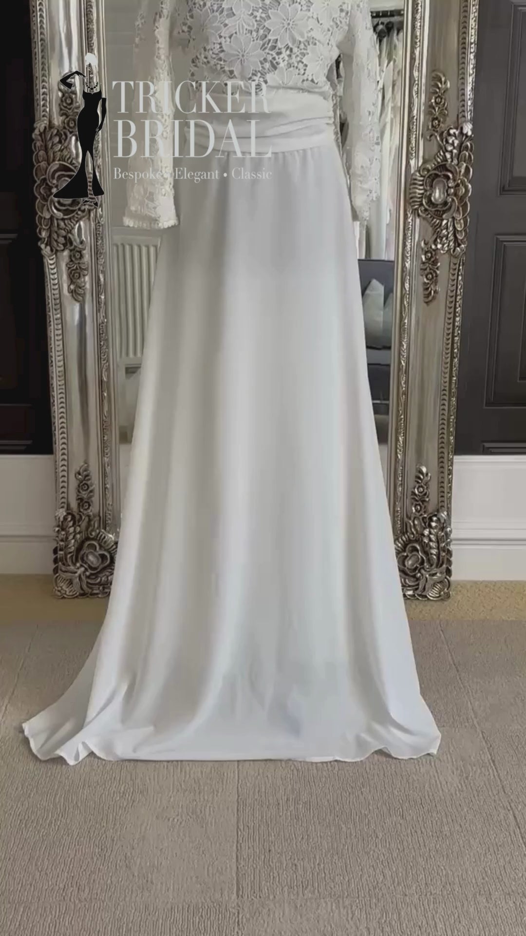 A gently defined waist gives shape without structure, flowing into a smooth A-line skirt that falls effortlessly to the floor in light a graceful georgette. The overall effect is calm, feminine and timeless — the sort of dress that feels just as right in a registry office as it does in a country house or garden setting.