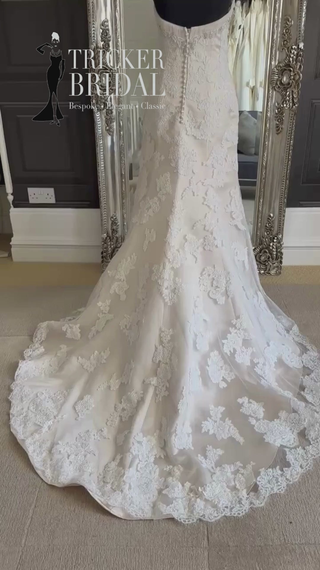 The silhouette is elegant and feminine, fitted through the bodice and hips before flowing into a graceful skirt and train. The lace is classic rather than busy. And then there’s the detail that really makes her special — a removable lace bustle train, finished with a satin bow at the back. It gives you two looks in one: full romantic drama for the ceremony, then a lighter, more relaxed silhouette for the rest of the day.