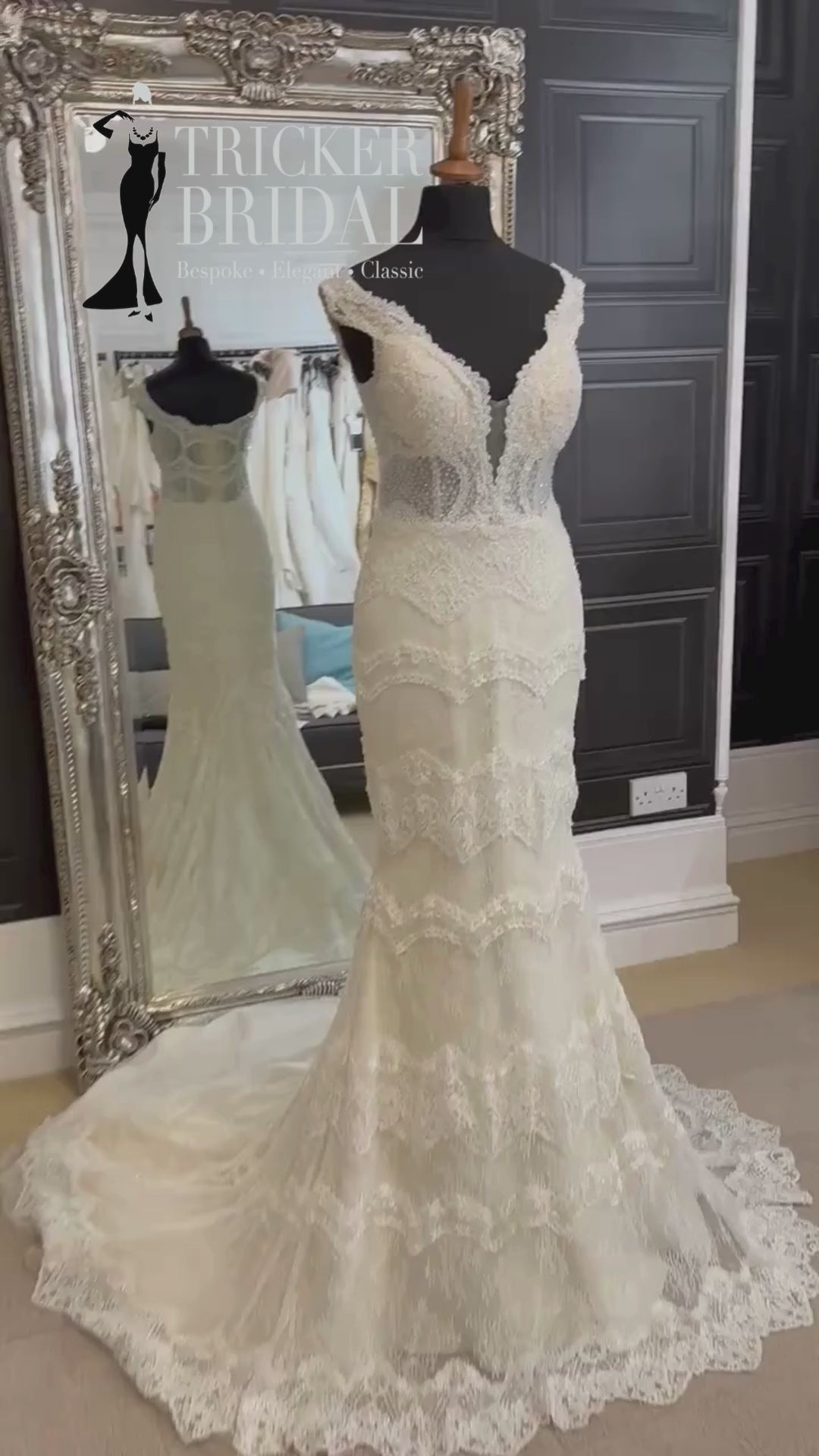 This preloved beauty is crafted from ivory lace placed oh-so-carefully over a soft tulle base, creating that dreamy, organic pattern you only get from really thoughtful design. The plunge-front bodice is corset-style and unlined, giving it that modern, barely-there feel while still feeling incredibly secure. She sits just on the shoulder and sculpts into a fit-and-flare silhouette that hugs in all the right places.