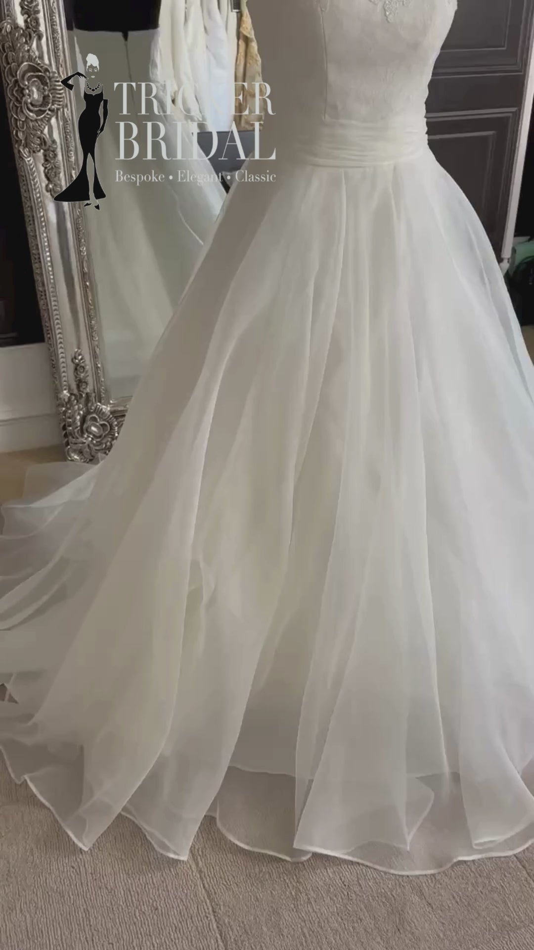 The strapless bodice, layered in organza over a delicate lace, is finished with subtle diamante and lace detail that sparkles softly. A ruched organza waistband nips in the waist and flows into a full, floaty organza skirt that catches the air with every step, ending in a wispy train that’s more cloud than fabric.
