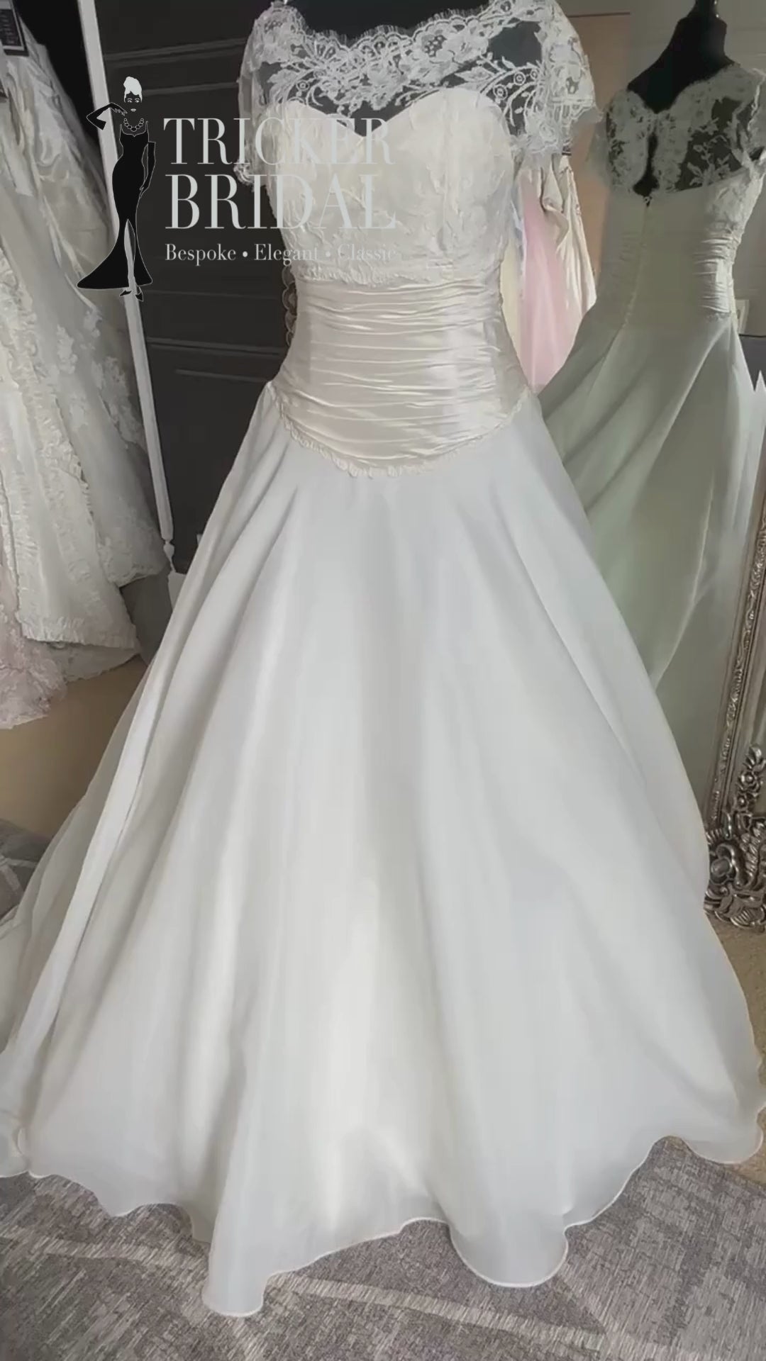 Her bodice is a mix of ivory lace and ruched taffeta, cut with a flattering scoop neckline and finished with the sweetest cap sleeves. From the waist, the look softens into a full chiffon skirt that floats as you walk, ending in a graceful train that’s pure aisle romance.