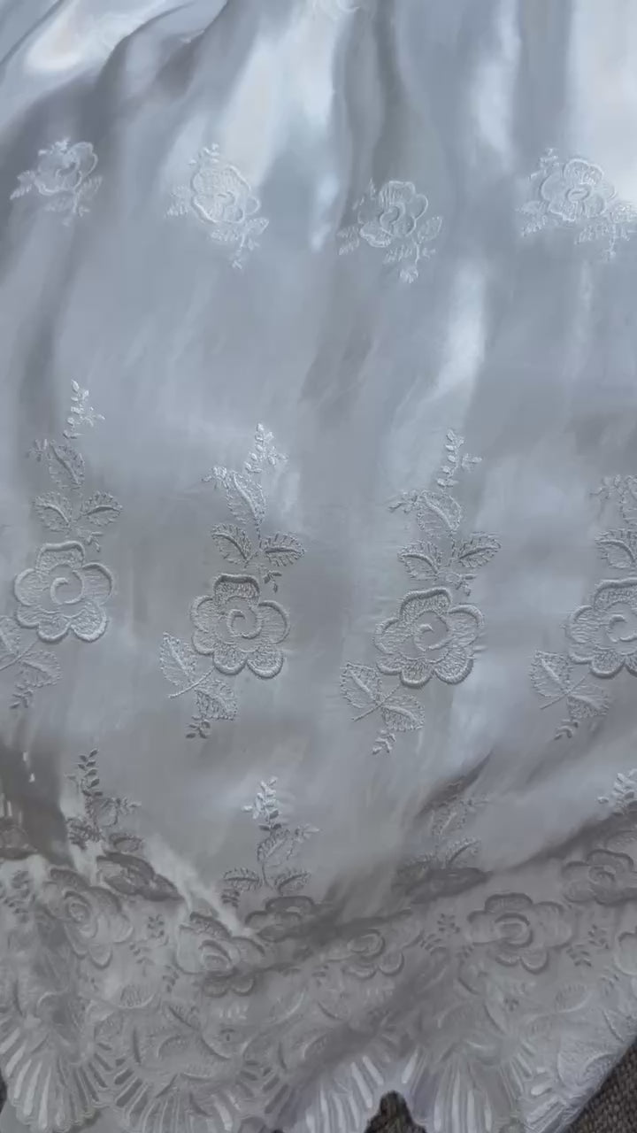 Satin showstopper with embroidered bodice, scalloped neckline and hem, and puff sleeves worn on or off the shoulder. A full swishy skirt for a proper entrance. Book a fitting in my Aberdeen salon or buy now— worldwide shipping.
