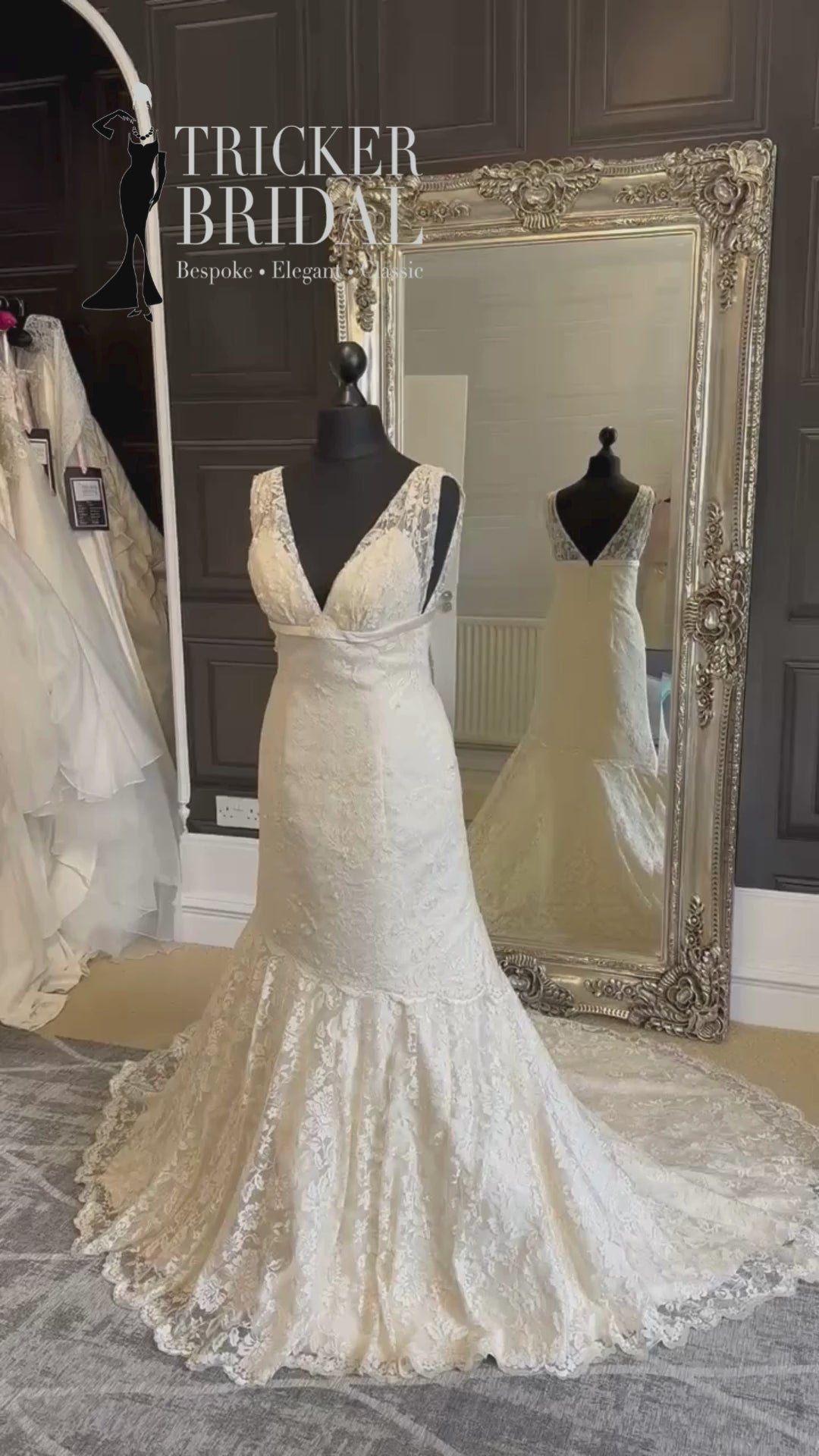 Cut in a flattering trumpet silhouette, she’s crafted in rich dark ivory lace with a soft V-neckline and empire line that feels elegant without ever trying too hard. A satin band beneath the bust is finished with a sparkling crystal detail, while tiny crystals scatter across the lace for a subtle shimmer. At the back, delicate crystal buttons trail neatly over the zip – a thoughtful touch that adds polish.