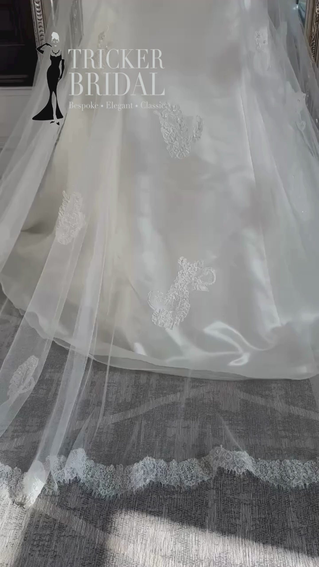 Her bodice is a masterclass in Alençon lace: long-line, delicately sequinned, and edged with soft scallops that trace the sweetheart neckline and lace straps. (Yes – straps you can wear with a proper bra, or at least a clever crossover. Hallelujah.) The back dips into a flattering V, finished with more scalloped lace that gives a final flourish as you walk away.