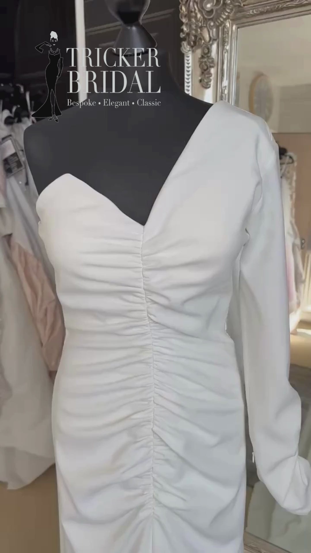 Part of my Rowley Hesselballe consignment (a brilliant label now sadly defunct), Lyra is named for the constellation, and she dazzles accordingly. Clever ruching runs throughout the bodice and skirt, shaping and enhancing every curve. The one-shoulder neckline brings full drama, balanced with a single slim sleeve detailed in soft ruching and finished with zip closures to keep the fit neat and close at the wrist.