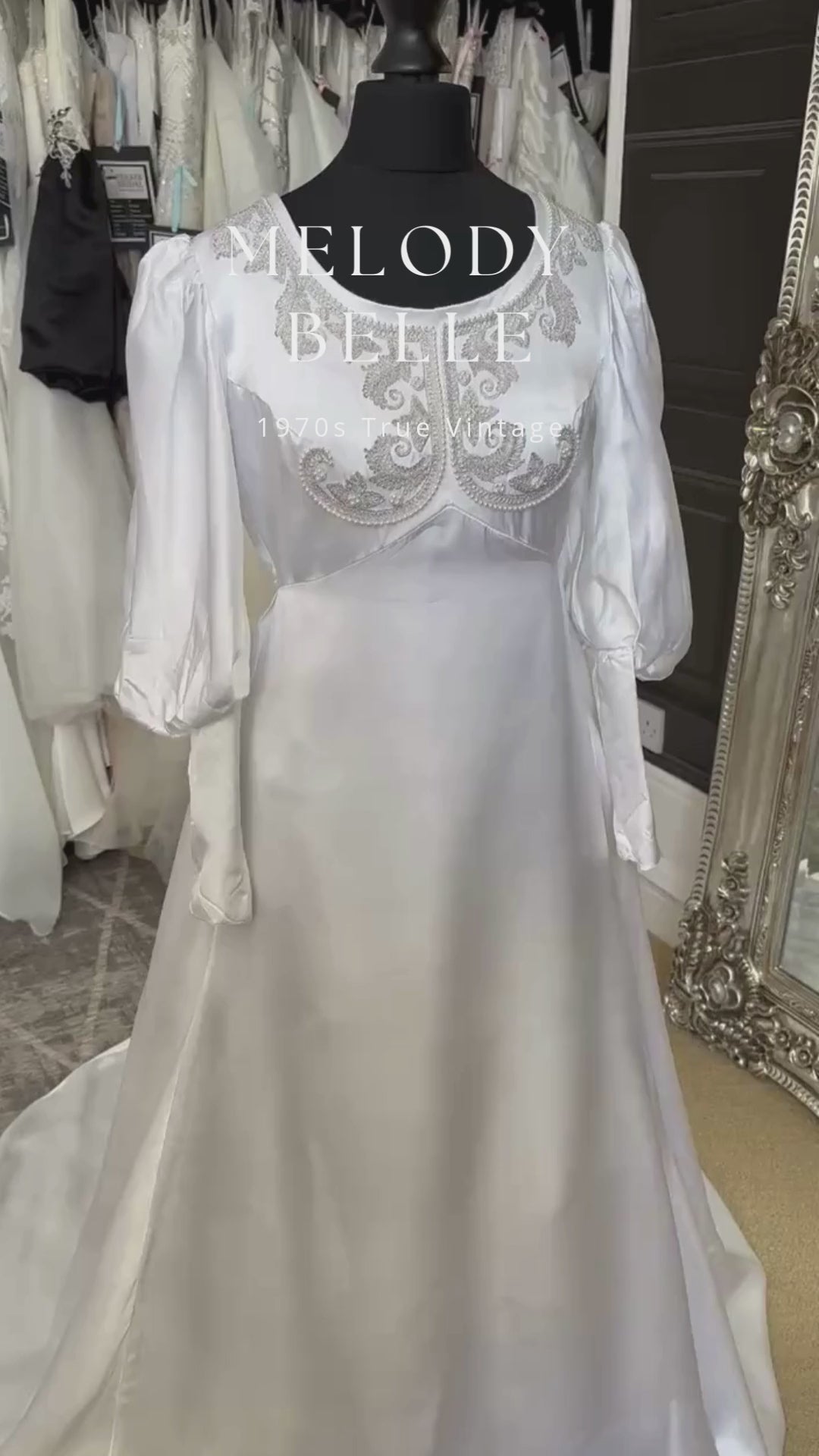 Soft white slipper satin with a pointed empire‑line bodice and a scoop neckline dripping with silver thread and beading. Dreamy bishop sleeves and an A‑line skirt that flows into a neat train. Cleaned and sparkling white. Try on in Aberdeen or buy in the Etsy shop — worldwide shipping available.