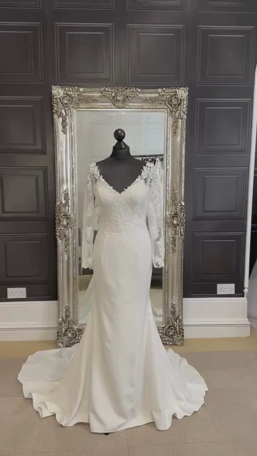 Lace covered bodice has a v neck and long illusion sleeves which fasten with covered buttons and loops. Sleek silhouette hugs the waist and flows and ripples into a gentle fit and flare.