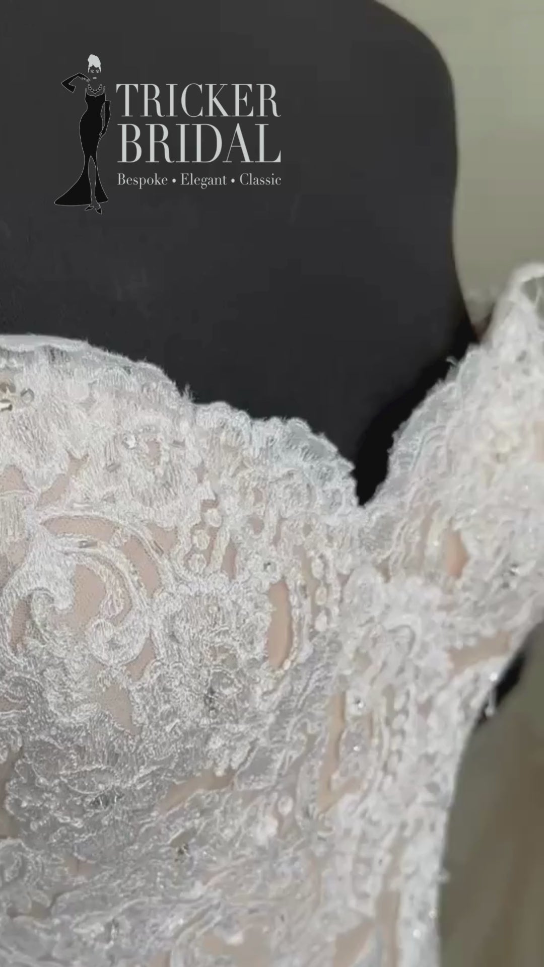 Ivory tulle lace layers over a nude underlay, creating a gown that’s both romantic and daring. The sweetheart neckline flatters, the fitted silhouette celebrates every curve, and the skirt flares into a dramatic tulle train that was made for golden-hour slow-motion twirls. She’s sultry, soft and a little bit rebellious – the kind of gown that makes people look twice.