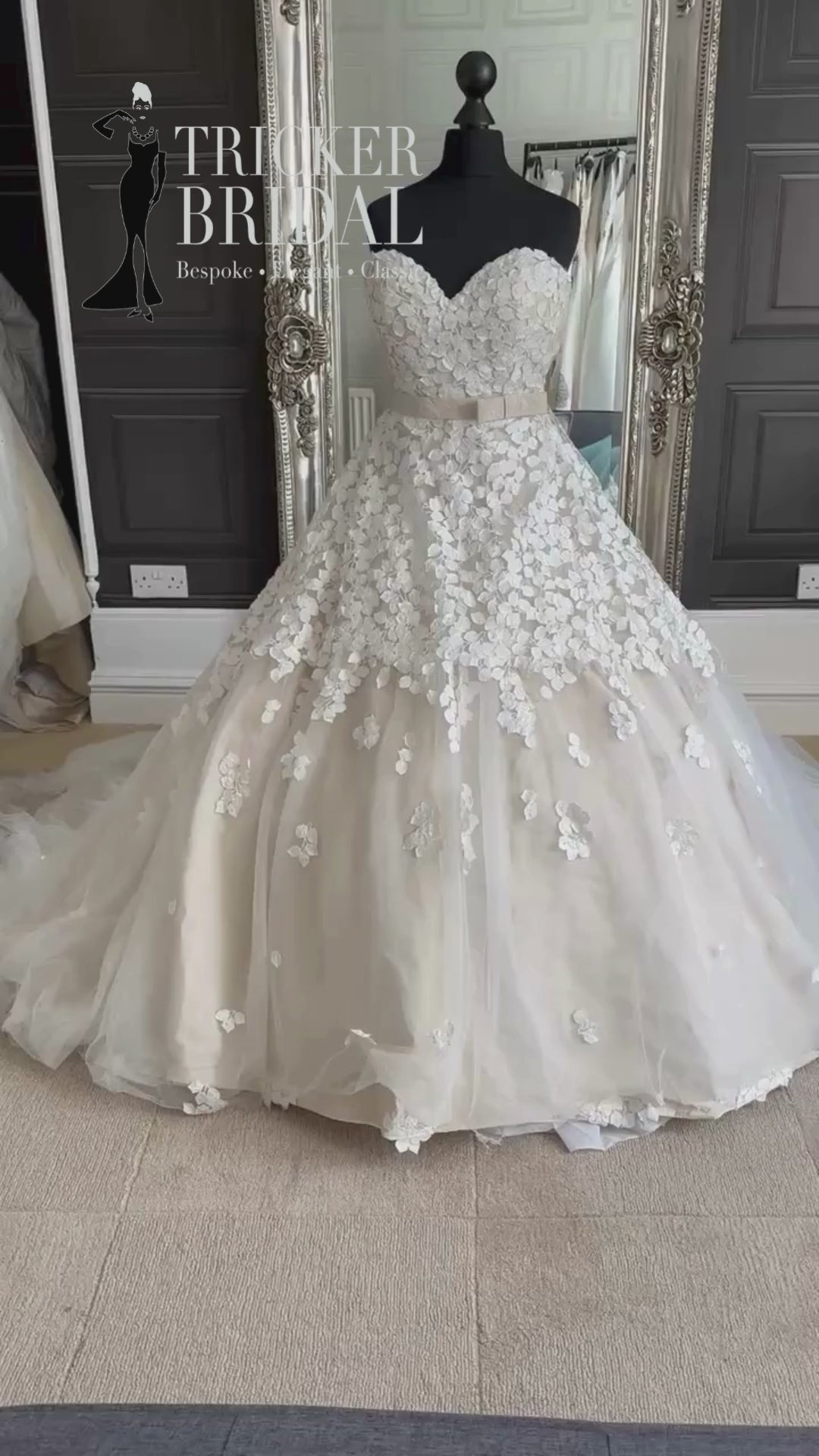 Ivory laser-cut leaves tumble delicately over a nude base, like sunlight through a secret garden. The bodice is sculpted into that unmistakable Ian Stuart shape — cinched, curved, and confident — leading to a sweeping ballgown skirt that deserves its own soundtrack (preferably something with strings and a standing ovation).