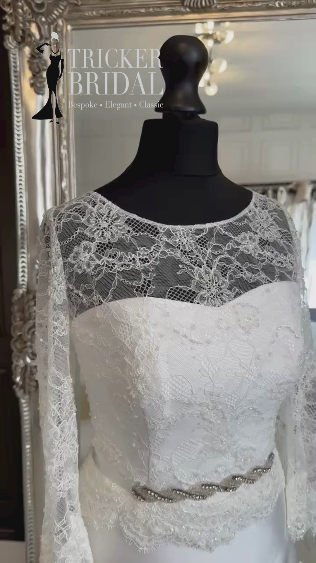 Her mikado A-line skirt flows effortlessly into a sweeping train, structured yet graceful, creating a silhouette that flatters without fuss. The bodice is cut from delicate Chantilly lace layered over a sweetheart under-bodice, with the lace embroidered in the tiniest pearls – a detail you only notice up close, and one that feels all the more special for it.