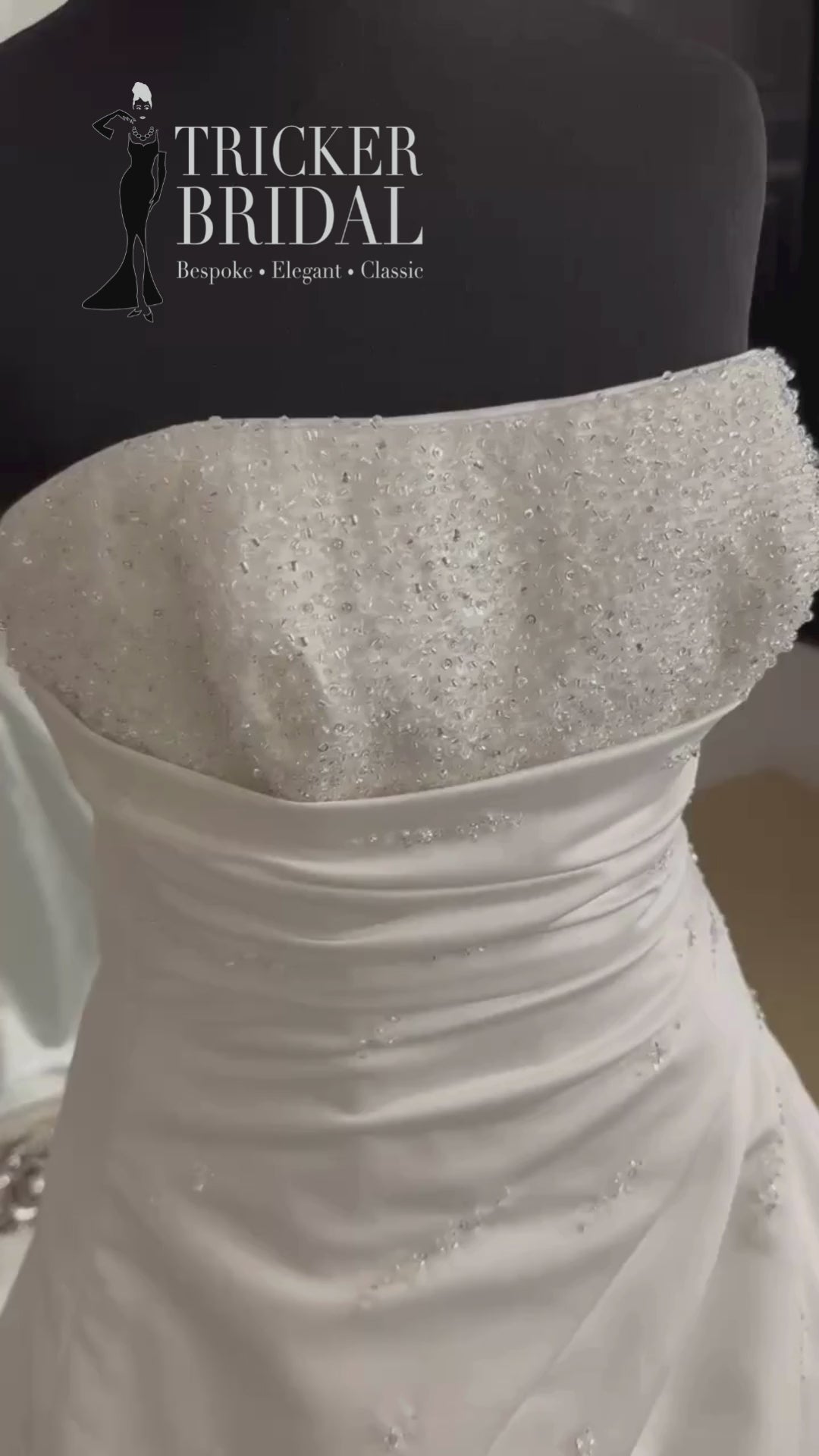 Her strapless scoop bodice is encrusted with intricate diamanté embellishments that shimmer beautifully as you move. Asymmetrical pleats flow from under the bust to the hip, sculpting a flattering silhouette before opening into a full skirt and a sweeping train.