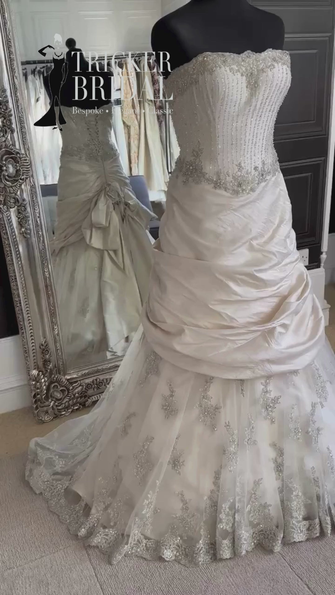 The heavily beaded basque corset shimmers with horizontal silver bugle beaded detailing, cinching the waist to perfection before spilling into a ruched satin bustle that sweeps over a glittering lace underskirt. Every inch is a masterpiece of texture and movement — bows, flowers and all the theatrical flourishes you’d expect from the late, great Ian Stuart.
