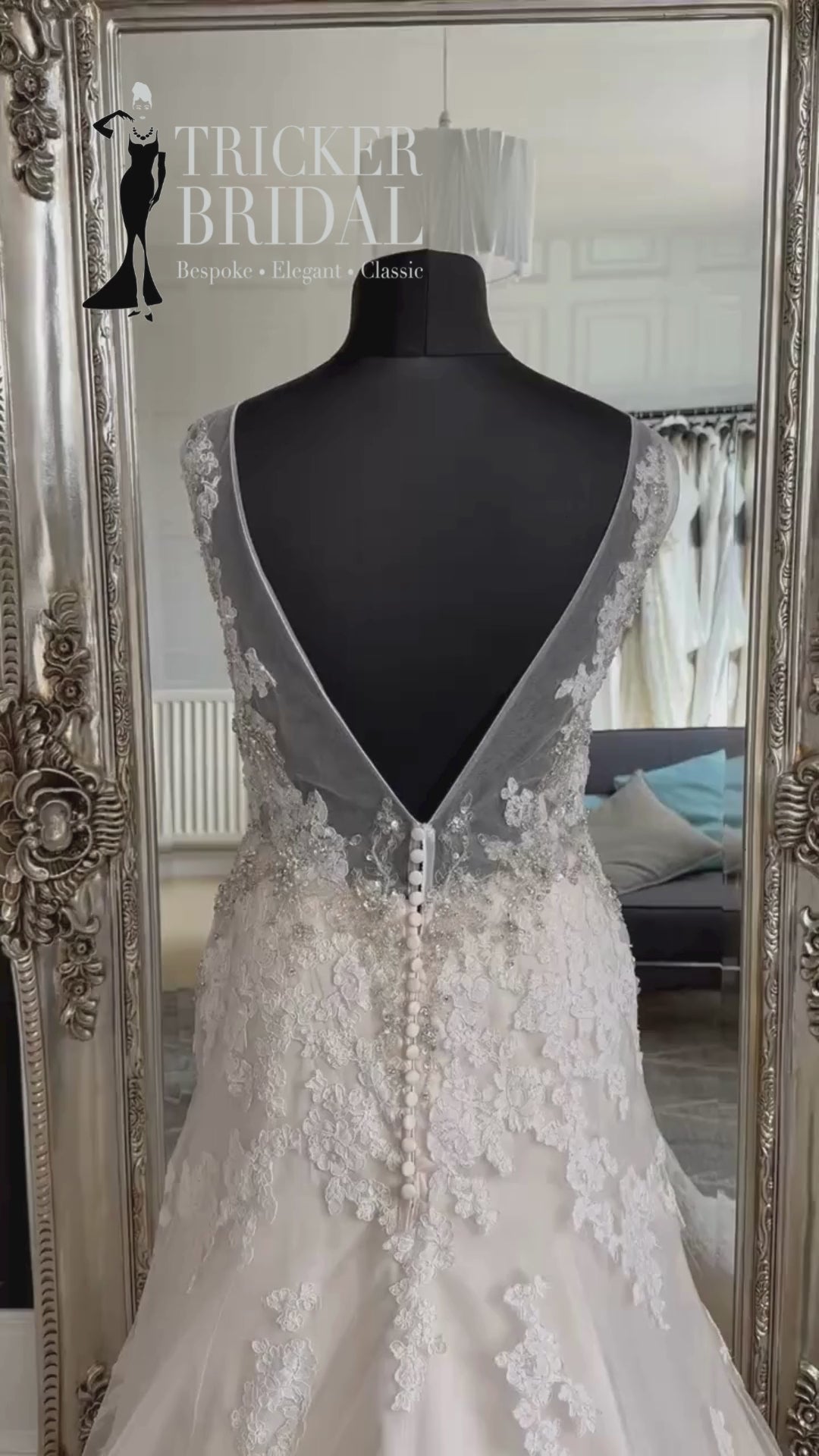 This mermaid-style gown is cut in rich ivory Alençon lace, hugging the figure with a dramatic V neckline and sleeveless silhouette. The hem and sweeping train are framed in deep lace, rippling out behind you like a whispered chorus. It’s romantic, it’s theatrical, and it’s made to be seen.