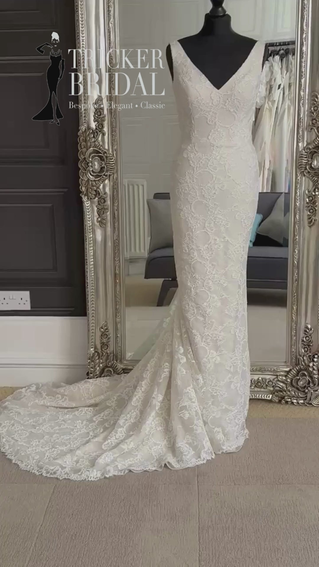 Beverley says, "It’s sculpted, it’s subtle, it’s pure movie-star elegance. The lace has just the right warmth, the train is perfection and that keyhole back? Honestly — it’s a show all by itself.”