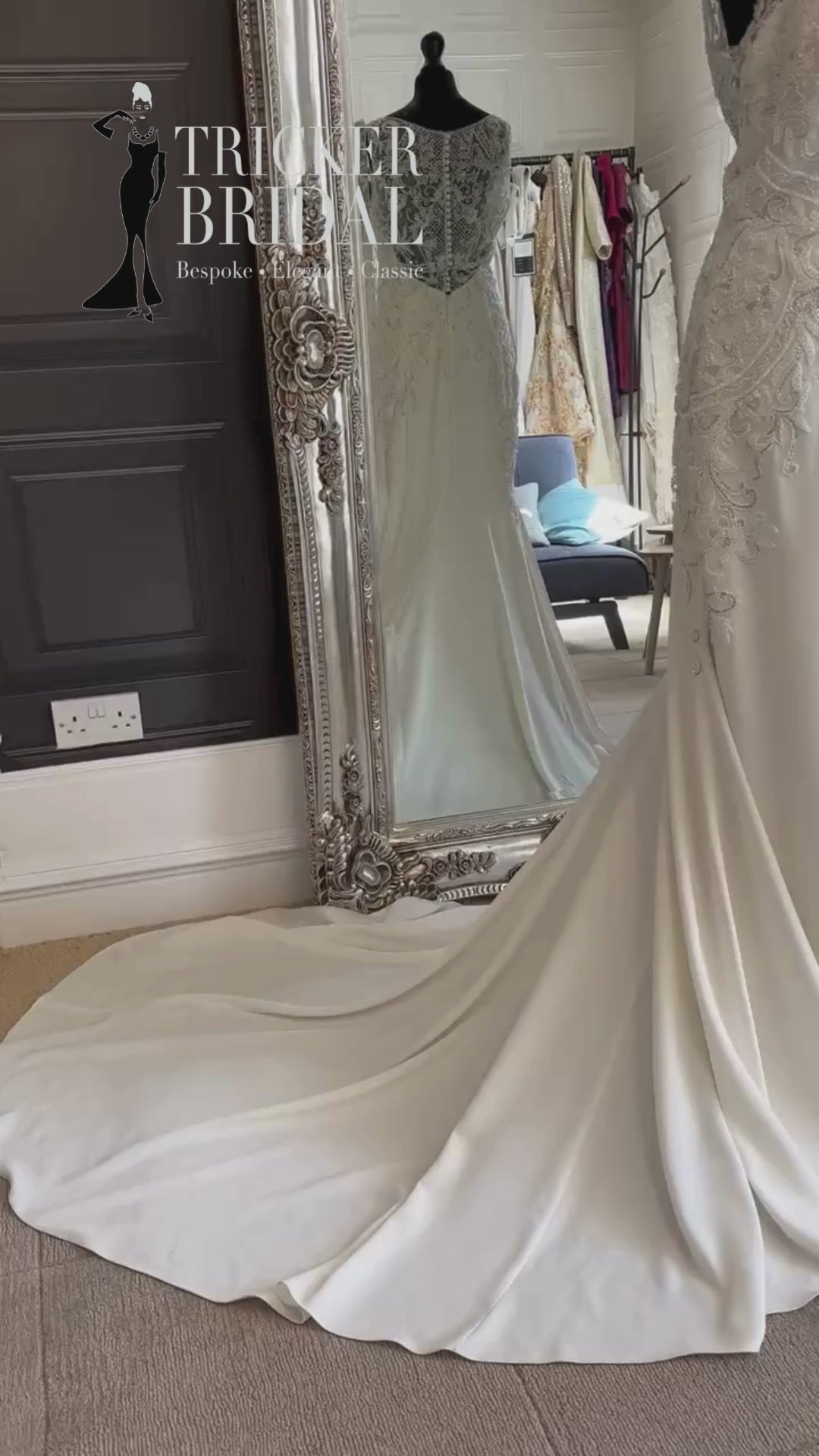 The embellishment doesn’t hold back: lace, beads and diamante shimmer across the bodice and hips before melting into a smooth flare, finishing in a trumpet skirt and train. The halter neckline frames the shoulders beautifully, while the back dips low — but not too low — striking that sweet spot between sultry and elegant.